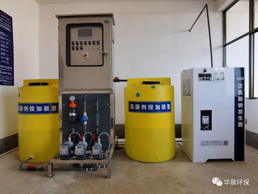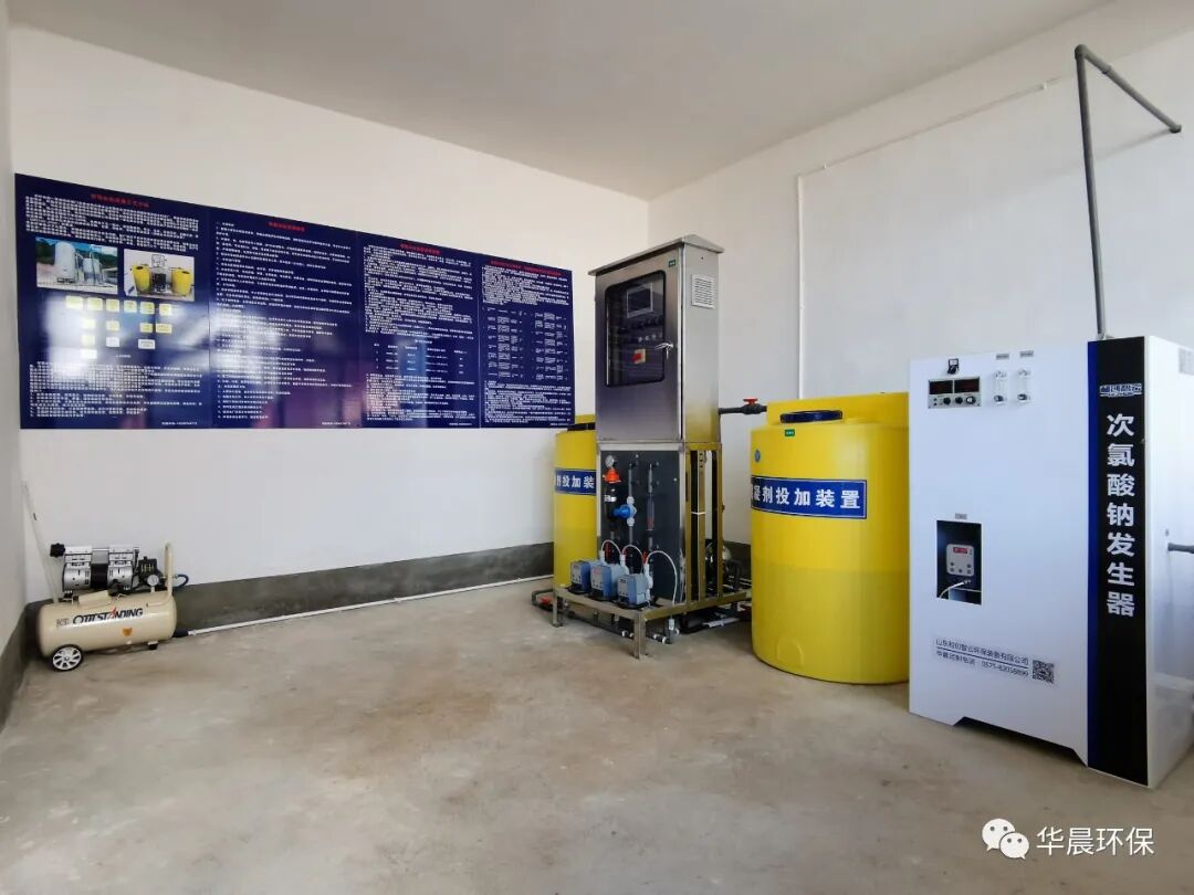 自动化加药装置、次氯酸钠发生器、气洗活化空压机等安装在管理房内。自动化加药装置主要向净水设备内提供絮凝剂(常用聚合氯化铝,PAC),促进源水中的微小颗粒凝结,便于沉淀、过滤去除。次氯酸钠发生器主要对精制无碘盐进行电解,产生次氯酸钠消毒溶液,并由计量泵向净水设备管道内投加,对水体进行消毒杀菌,并保持一定余氯,可防止细菌等在清水池、管网内滋生。空压机主要在滤砂气洗活化时提供气源,定期气体擦洗作用可以帮助清洁滤砂,延长滤砂使用寿命。